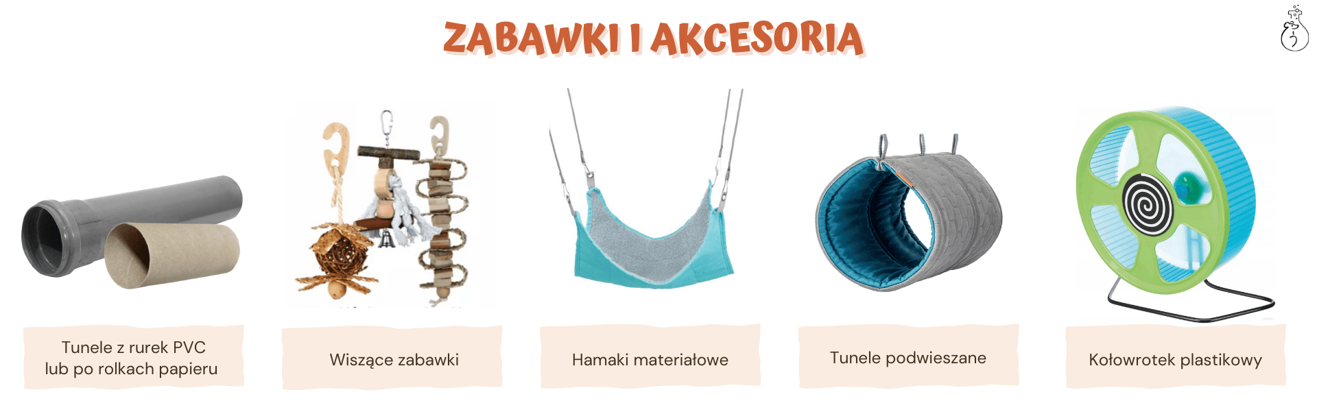 Myszy uwielbiają kopać oraz kryć się w rozmaitych zakamarkach, dlatego ważne jest, aby w mysiej klatce znalazły się tunele oraz takie rodzaje legowisk, gdzie myszka będzie czuła się „schowana” i bezpieczna. Fajnym urozmaiceniem są także podwieszane zabawki oraz hamaki. Rurki po papierze toaletowym i rurki PCV świetnie sprawdzą się jako zabawki.