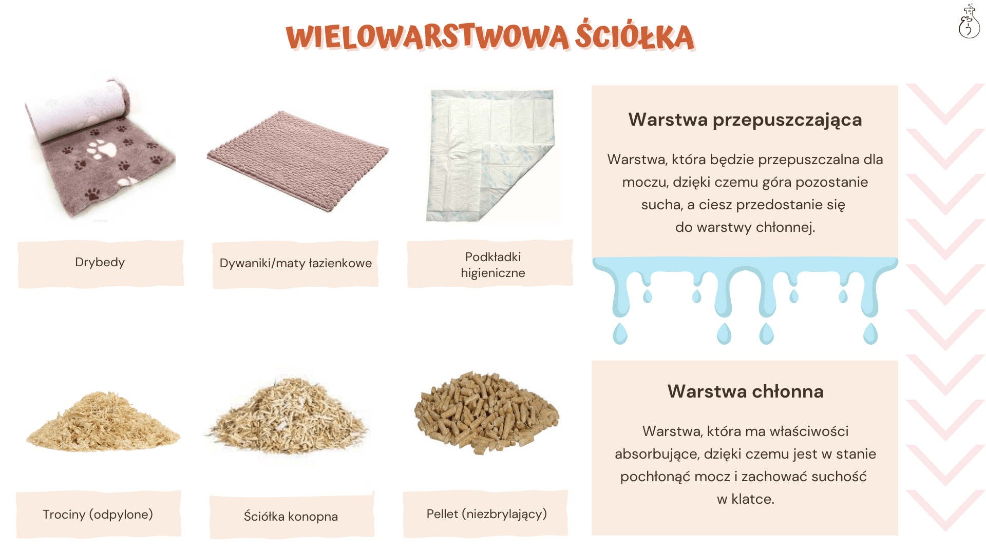- Drybed (Vetbed) – materiałowy dywan, który jest tak zbudowany, aby cały mocz został przepuszczony w dół, aż do warstwy chłonnej. Jest to rozwiązanie bardzo wygodne dla świnek, lecz kosztowne. Przed zakupem warto sprawdzić, czy dany produkt jest oryginalny. Wraz ze spadkiem ceny spada zwykle również jakość produktu.